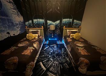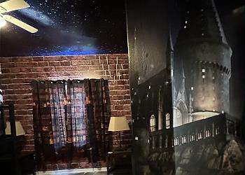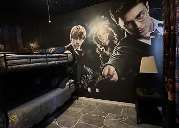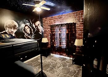 Designed with comfort and entertainment in mind, the villa accommodates up to 9 guests with an ideal layout for families and groups. Sleeping arrangements include a luxurious king master suite, a cozy queen bedroom, a fun full-size bunk bed with an additional twin trundle, and two twin beds—perfect for kids or teens. Each room is thoughtfully decorated, with themed bedrooms inspired by Harry Potter and Star Wars that bring the magic of your vacation to life.